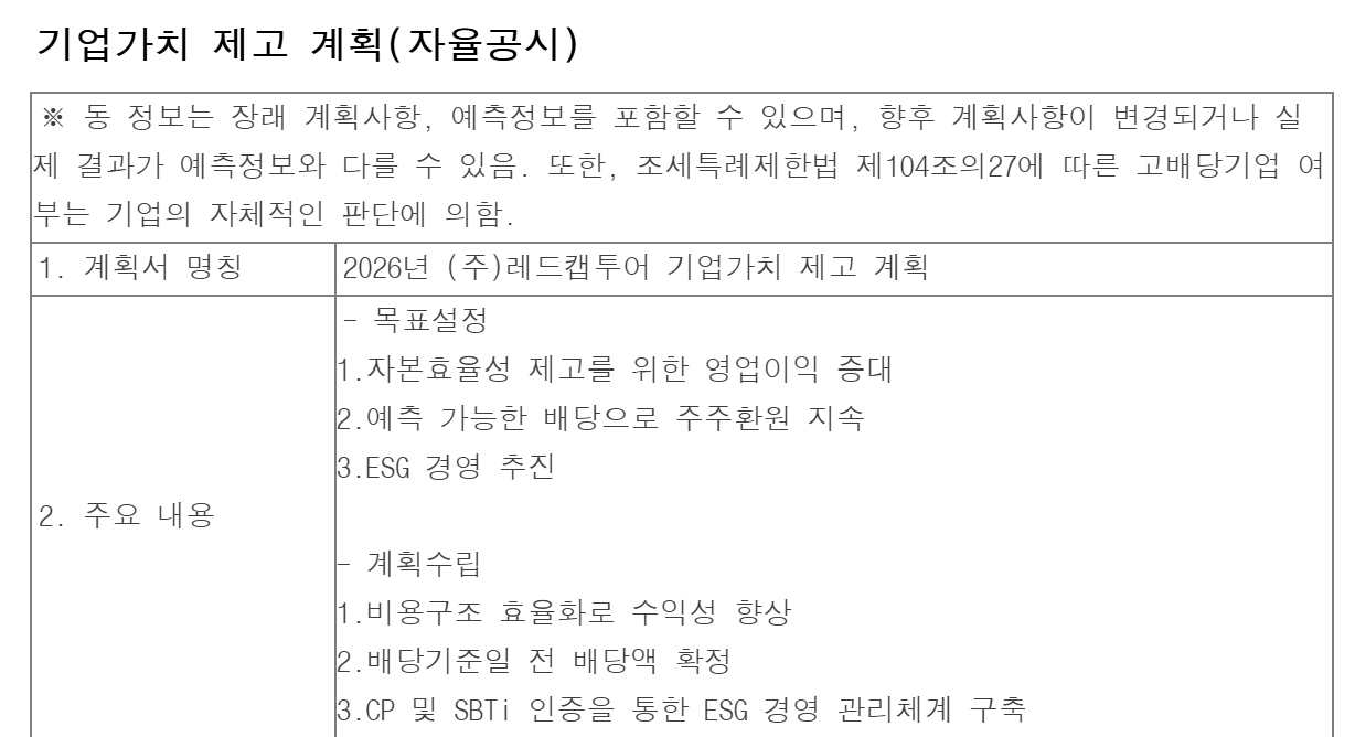 레드캡투어(038390)는 올해 기업가치 제고를 위한 경영계획과 주주환원 정책을 담은 자율공시를 발표했다. 이번 계획에는 자본 효율성 증대, 예측 가능한 배당 지급, ESG 경영 강화 등이 포함됐다.